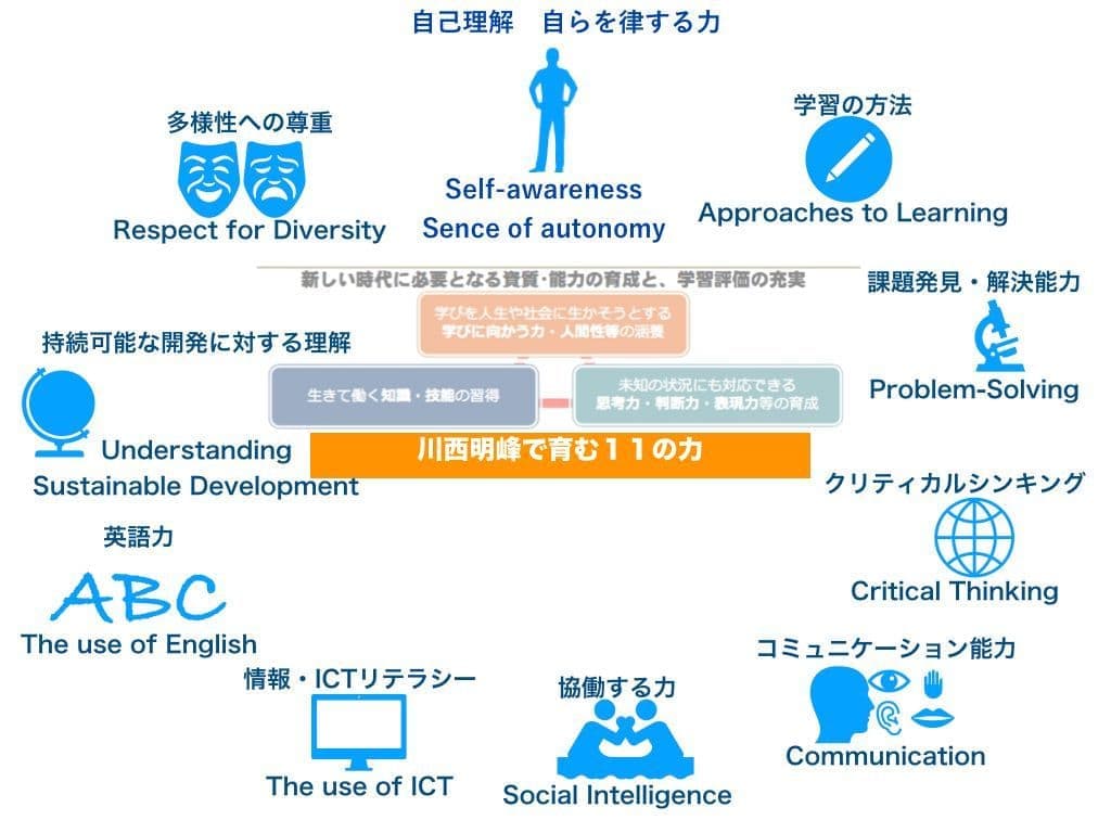 - 英語科、情報科、ALTによる複数の教員で授業を行います。この必修科目で「川西明峰GC類型で育む11の力」を伸ばしていきます。