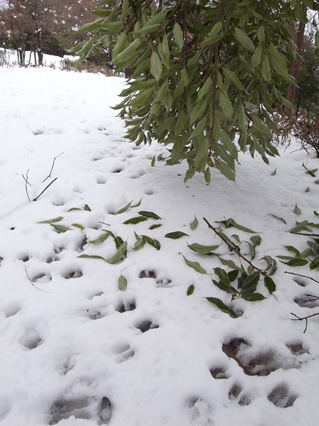 この雪の重みで折れた枝を、首尾よく利用しているものがいました。生活棟に続く中央階段で、大きくうなだれたシラカシの枝先が何者かに食いちぎられています。さらに地面には葉っぱが散らばり、足跡(あしあと)も残されていました。このことから推測すると、どうやらニホンジカがつい先ほどまで枝葉を食べていたようです。人間の接近に気付いてこの場を立ち去ったのでしょう。次の日この枝の様子を見に行くと、すっかり食べられ丸裸(まるはだか)になっていました。