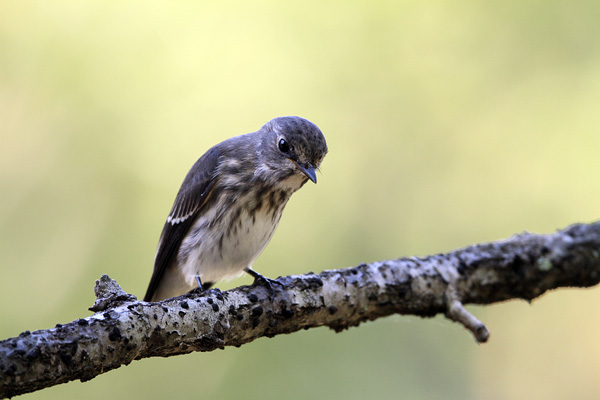 それでは、改めて本校に滞在(たいざい)している、エゾビタキの様子をご覧ください。横枝にとまったエゾビタキは、盛んに頭を動かしています。上を見ていたと思うと、横を向いたり、下を覗(のぞ)いたりと落ち着きがありません。他の枝に移っても、しきりに地面を気にしています。