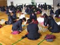 | 1年生を対象に、恒例の百人一首大会を開催しました。 学年を約40グループに分けて、互いに競い合いました。 | ![]() |