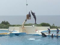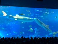マリン体験後、シャワーを浴びてリフレッシュ。昼食をとって「美ら海水族館」へ。 イルカショーではボール遊びやジャンピング、そしてダンス。イルカって賢いですね。水族館ではジンベイザメの餌やりも見学。大きな口を開けて水ごと飲み込んでいました。 |