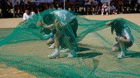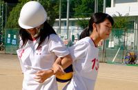 交流行事では、姫路別所生と姫路特別支援学校の生徒が一緒になって行う「トライ4」。このレースはテニスラケットにボールを乗せて走ったり、借り物競走をしたり、一緒にゴールを目指します。 綱引きは学年どうしの一騎打ち。学年のプライドをかけて戦いました。 |