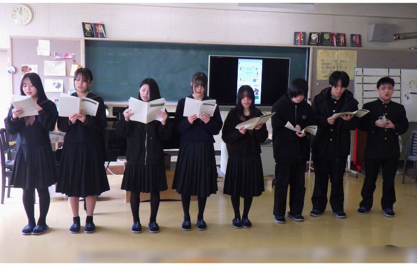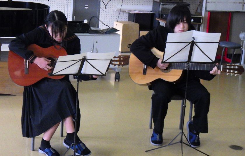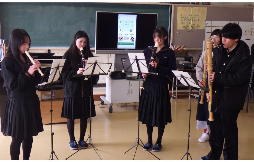 ☆NEW☆音楽Ⅱ 発表会を開催 音楽Ⅱを選択している8名が、1・2学期に取り組んできた楽曲を発表する演奏会がありました。 全員合唱に加え、リコーダー四重奏、ギター弾き語り、箏二重奏など多彩な演奏が披露されました。 見に来ていた先生からは「感動しました」や「素晴らしい演奏、ハーモニーでした」との声が寄せられました。 生徒たちは「終わってほっとした」「担任の先生が来てくれて緊張したけれど、うれしかった」と達成感に満ちた表情を見せ、努力の実った心温まる発表会となりました。 2月12日 音楽Ⅱ