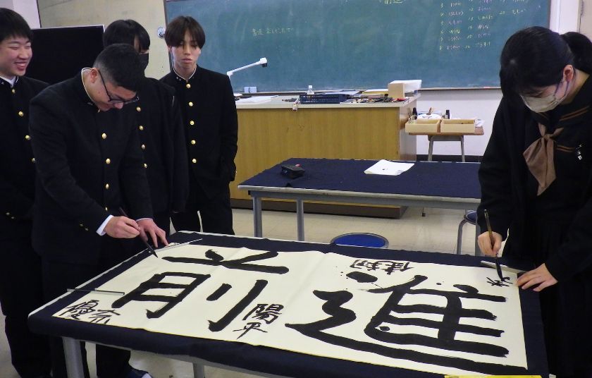 書道Ⅰでは「挑戦」の文字を題材とし、全員で一つの作品を仕上げました。一人一画ずつ、力強く筆を入れる姿が見られました。