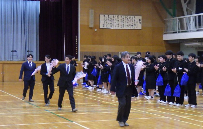☆NEW☆離任式を行いました 6時間目に離任式を行いました。 木原先生、望月先生、田中先生、山田先生からは、これからの学びに向けた励ましの言葉や、生徒の背中を押す温かなメッセージ、本校への思いをいただきました。 生徒会長の上田早翔さんから「先生方からいただいた言葉を行動に移すことが恩返しになると思っている」との言葉と感謝の気持ちが伝えられました。 放課後には、恒例となっている麒麟獅子舞部によるはなむけの演舞が披露されました。 4月10日
