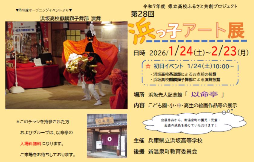 ☆NEW☆浜っ子アート展 第28回浜っ子アート展を開催します! 場所は、浜坂先人記念館「以命亭」です。新温泉町内のこども園、小、中、高生の絵画作品を多数展示しています。 会期:1月31日(土)~2月23日(月祝)まで。 *オープニングイベント 1月31日(土) 行いまいす。 ご来場お待ちしております。