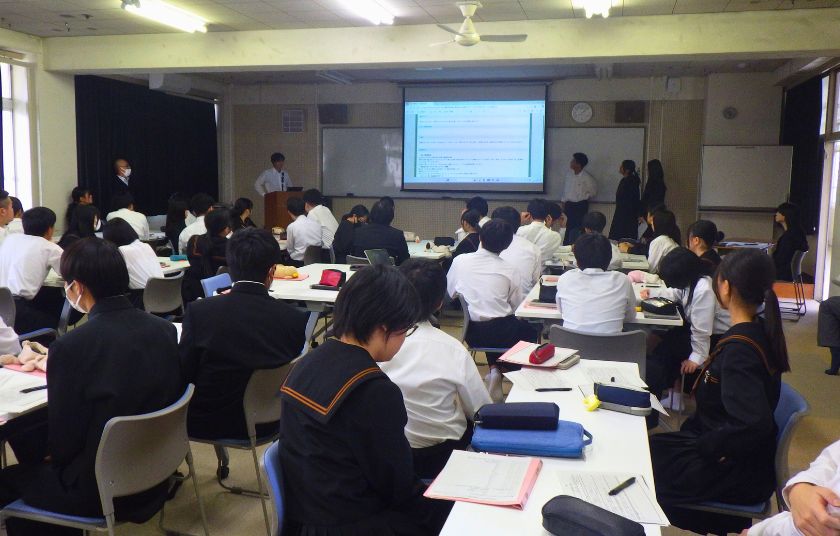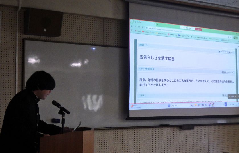 1年生が企業課題に挑戦!3分間のプレゼン発表会 1年生が総探で、ICTツールを活用し、港湾企業の抱える課題解決に挑戦しました。 普段接することのない業界ですが、生徒たちは自ら調べ、アイデアを練り、3分間のプレゼンを実施しました。 事前にゲストティーチャーからの助言を受け、発表後には企業の方々から実践的なフィードバックもいただくなど、社会とつながる学びを経験しました。 事前リハーサルで、今度さんに的確なアドバイスをいただきました
