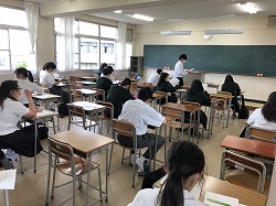本校では、2年で1単位、3年で2単位の総合的な探究の時間を設定しており、今年が実施初年度となります。分散登校の中、第1回目となる授業が行われ、各教室でこれから取り組む探究についての説明がありました。