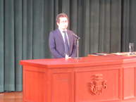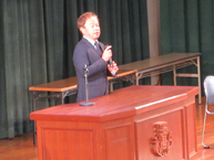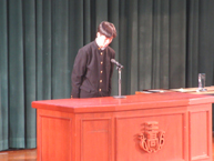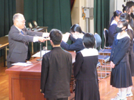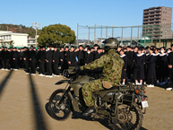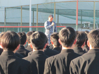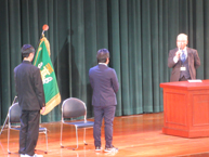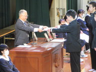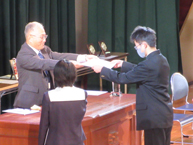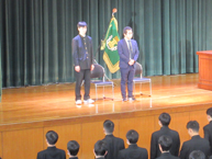 | ■顧問による紹介 「今回、上位で完走し、全国大会の出場権を得ることができました。まだ1年生なので、技術を全て持っているわけではありませんが、機械研究部の先輩、同級生、みんなで相談・協力し合い、結果的に出場できました。全国大会に出て、0.1秒でも早く走らせるように頑張ってきますので、引き続き応援の方よろしくお願いします。」 ■選手挨拶 「全国大会では頑張りますので、応援よろしくお願いします。」 ■学校長激励の言葉 「全国大会は高いレベルの選手が多くいるんだろうなと思いますが、大会まではまだ時間があるので、全力を尽くすのはもちろんですが、全国で上位を収めるロボットの技術など、生徒たちがどのようなものを作り上げていて、どういう考えで挑戦しているのかをしっかり見てきて、今年の結果だけではなくて、来年またへの心の成果も踏まえて臨んできてほしいと思います。」 ■同窓会より激励金授与 「来年は創立90周年です、周年のまず1番目のおめでたい報告として、ぜひ楽しみな報告をお願いしたいと思っています。ぜひ90周年には元気な姿で参加してもらいたいと思っております。皆さんと共に祝いたいと思ってますので、どうかよろしくお願いします。」 |