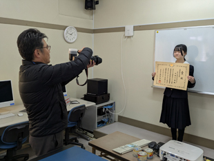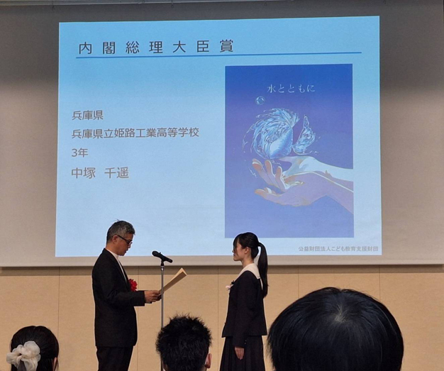 | デザイン科3年生の中塚千遥さんが、公益財団法人こども教育支援財団が主催する第17回環境教育ポスターコンクールで内閣総理大臣賞を受賞しました。また、2025年11月9日には、東京で表彰式に参加し、表彰状が授与されました。授賞式後は環境教育シンポジウムにも参加しました。 |