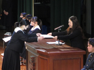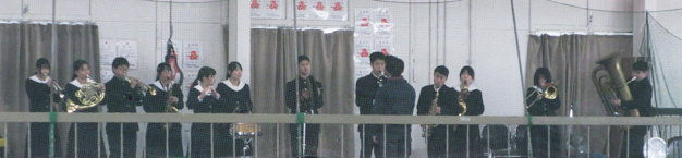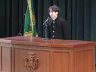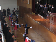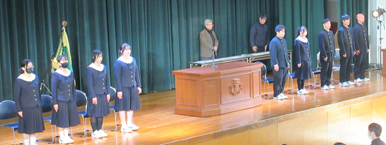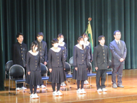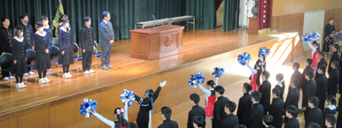 | ■顧問による紹介 「今日はこのような会を開きいただきありがとうございます。バンドの編成ですが、ボーカルが2名、ギターが2名、それからキーボードが2名となります。曲の大きな特徴としては、ボーカルの2人のコーラスの掛け合いが、非常に綺麗なハモりがあって、大会、予選大会でも大きな評価を受けました。オリジナル曲に託して、会場の人たちに姫路工業高校の軽音楽部として頑張っていきたいと思いますので、また応援してあげてください。高校生が高校生の時にしか歌えないような気持ちを歌にしていますので、また共感できると思うので聞いていただいたらと思います。」 ■代表生徒による挨拶 「本日はこのような会を開いていただき、本当にありがとうございます。兵庫県を代表して全国大会に出場することになりました。日頃の練習の成果や、これまでの大会で培ってきた技術や演奏力を存分に生かしていきたいと考えています。この全国大会に関わってくださる方々への感謝の気持ちを忘れず、姫工生らしい規律ある行動を心がけ、良い結果を残せるよう全力で頑張ってまいります。応援よろしくお願いします。」 ■葆光会会長激励金授与 「全国大会に出る素晴らしい選手のみなさん、ぜひ頑張ってください。葆光会のメンバー、先輩として、本当に嬉しい限りです。ぜひ、これからも日本一の工業国を目指して頑張っていただきたいという風に思います。」 ■教頭激励の言葉 「兵庫県予選大会で見事グランプリ獲得をされ、おめでとうございます。昨年度に引き続き兵庫県予選大会2連覇です。素晴らしい結果だと思います。全国大会でも練習の成果を発揮して、名古屋の大きな舞台を任せてください。応援しています。」 ■応援団によるエール |