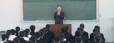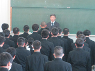 | ■教頭先生激励の言葉 「学校の授業ではできない生の体験です。会社に、行かせてもらっているということを絶対忘れないでください。 現場のプロの姿を学んでください。そして社会人としての意識を持ってください。また、働くことの意義を見つけてください。将来の進路について考える機会を、企業さんにいただいて、「ありがとう」という気持ちで。最後に、とにかく安全第一で頑張ってきてください。」 ■代表生徒挨拶 「インターンシップのために、実行委員や担当の先生が裏で色々と動いてくださいました。この期間、社会に出て、学校では普段学べないようなことがたくさんあると思います。活動中に学校で意識しているアヒルや「報・連・相」を徹底し、責任感のある行動を心がけます。 最後に、このインターンシップのテーマでもある1歩成長の一歩を踏み出し、学校生活をより良いものに変えることができるようにみんなで頑張ります。」 |