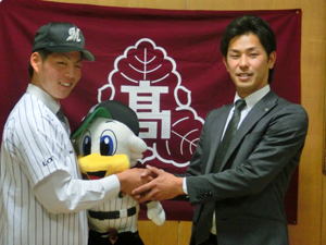 2013年10月24日に行われたドラフト会議で千葉ロッテマリーンズから育成1位指名を受けた肘井竜蔵君が 11月26日の仮契約、12月3日の入団発表を経て、北条高校初のプロ野球選手となりました。 2014年の年明けから2軍の合同自主トレ、2月1日から石垣島でのキャンプに参加します。