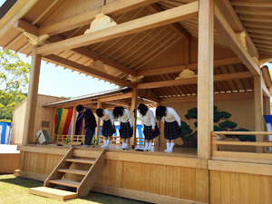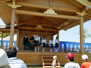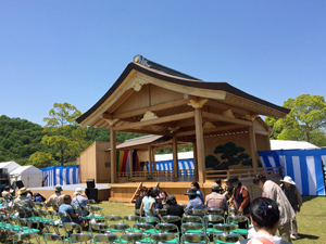 玉丘古墳で播磨の国風土記1300年祭が行われ、新作狂言「新根日女物語」の行われた能舞台で
