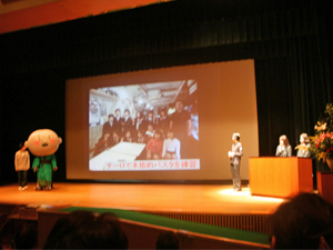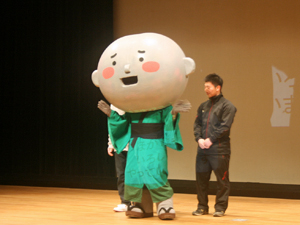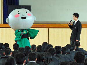 1年生を対象に行われた部活動紹介で、ふるさと創造部の紹介をしました。 ふるさと創造部として生徒の前に出たのはこの日が初めてでした。 本校のマスコットキャラクターらかんくんに来て貰いました。