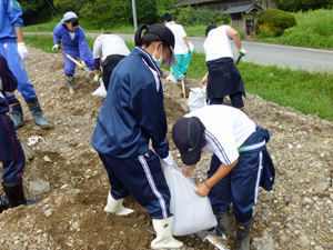放送部、生徒会メンバーと共に丹波市へ災害ボランティアに行きました。 大雨により土砂崩れや浸水の被害に遭った地域へ出向いて午前は土のう作り、午後は土のう積みを行いました。 慣れない作業に苦戦しながらも丹波市の一助になればと、一生懸命頑張りました。
