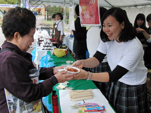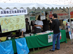 県立フラワーセンターで行われたじば産物産展に参加しました。 料理は明石市で人気のイタリア料理店「チーロ」の小谷さんに、お店のデザインは五百藏さんに指導していただき 部員が考えた3種類(トマト・クリーム・和風)のパスタを販売しました。 出店でパスタという初の試みでお客様をお待たせする一幕もありましたが、おかげさまで完売することができました。 ステージではダンスとらかんくんマーチを熱演、小雨のぱらつく中でしたが多くの方にパスタとダンスを堪能していただ けたのではないでしょうか。