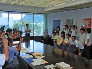 市役所での記者会見はたくさんのカメラに囲まれ、はじめは緊張した様子でしたが次第にポーズをとったりして 和やかなムードのなか行われました。