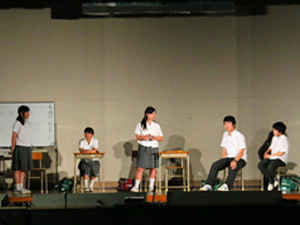 加西市民劇団「おおきな木」のみなさんに演技指導をしていただき、演劇に挑戦しました。 部員は全員演劇初挑戦でしたが、基礎の発声練習からはじめて、台詞にあわせて動きや間をつけたり 裏方は照明・音響・場面転換が滑らかにできるように練習をしてきました。 練習期間は約3ヶ月と短いものでしたが、50分の長丁場を演じきった部員の達成感に満ちた表情が印象的でした。
