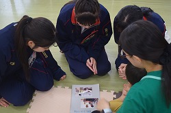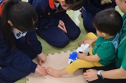 10月27日(月)5限の3年生選択科目「保育基礎」の授業で、赤ちゃん先生プロジェクトの方々が来校されました。4組の赤ちゃんとお母さん、インストラクターの方々から、妊娠中の経過や、赤ちゃんがいる1日の暮らしなど様々なことを教えていただきました。生徒達は赤ちゃんと手足を合わせてみて、こんなに小さいんだと驚いていました。また、興味津々で様々な質問をお母さんに聞いていました。