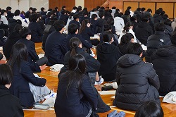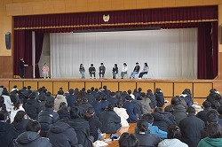 2年生向けに合格者体験談を実施しました。(2026.03.19) 2年生を対象に、卒業生による合格体験談を実施しました。今回はパネルディスカッション形式で行い、受験に向けた心構えについて、それぞれの経験をもとに語ってもらいました。 また、おすすめの勉強方法やオープンキャンパスの重要性についても具体的な話を聞くことができました。これにより、2年生は自分たちの進路実現に向けて意識を新たにし、気持ちを一層高めている様子が見られました。