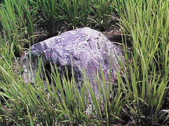 由来のある石 この石は、ふつうの石に見えるけど本当は、すごく大きい石です。 この石を神様が苅屋の富嶋神社から中島の西の方まで投げたという伝説があります。 |