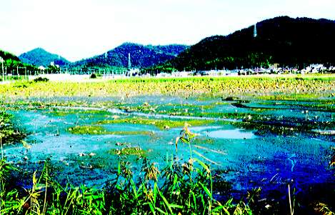 周囲が4q。太子町で一番大きな池。文覚というおぼうさんがしきをとって、米作りのために池を作りました。