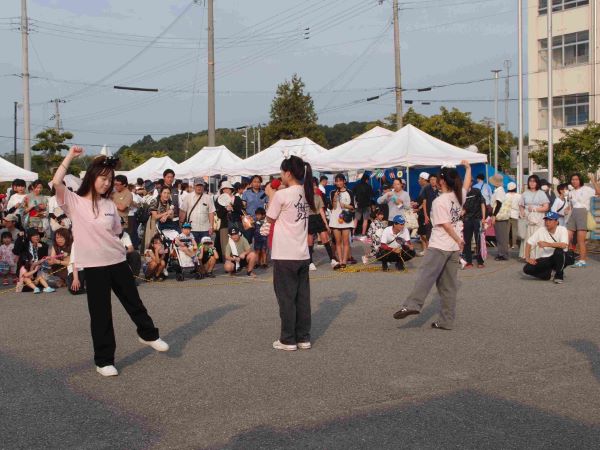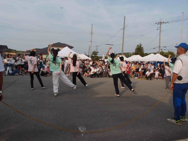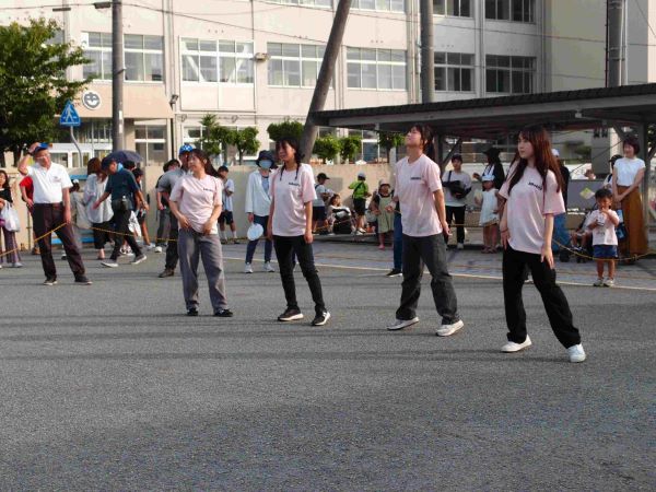 当日は私たちの予想を上回る盛況ぶりで、地域の多くの方々の前で、4曲、リズムダンスを披露しました。「老若男女、誰もが楽しめる楽曲を。夏祭りをさらに盛り上げるように。」を目的に選曲いたしました。「U.S.A」や「ジャンボリミッキー」は観客のみなさまも一緒に口ずさんだり、一緒に踊ってくださる方々もおられ、部員たちが元気をいただきました。