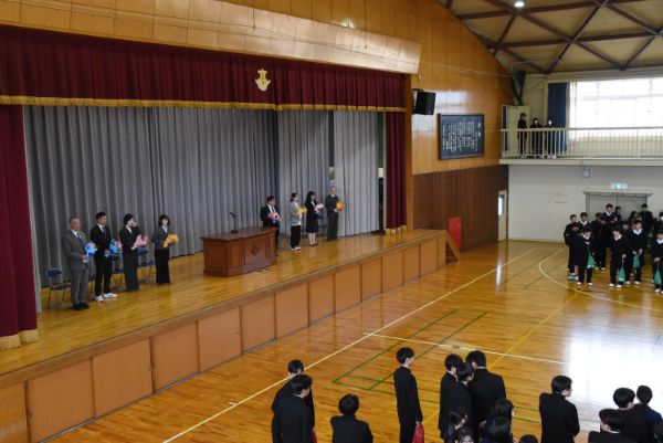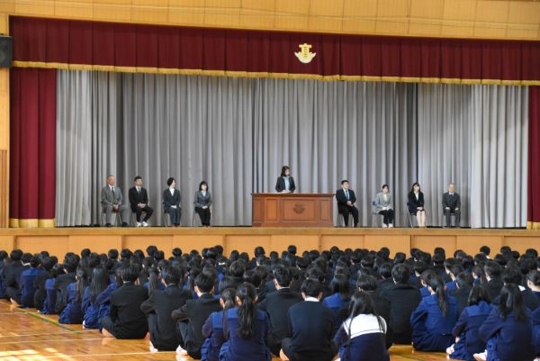 2026年4月9日(木)離任式が行われました。 今年度も、多数の先生や職員の方々の異動があり、本校を転出される方を送る離任式が行われました。離任の挨拶では、年次や部活動等で活躍された先生方の本校への思いが伝わる式となりました。 「2026/04/09up]