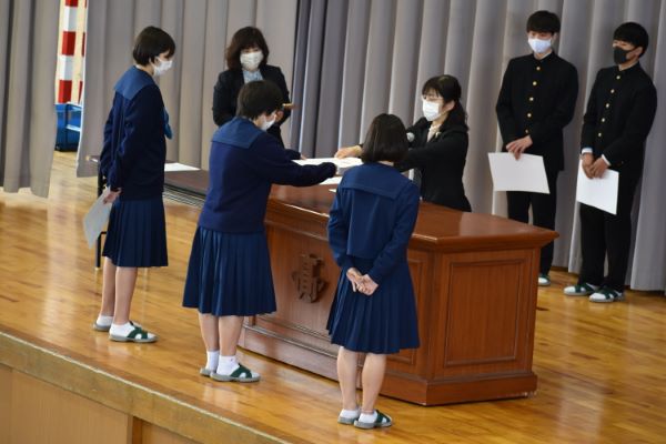 2021年4月8日(木)令和3年度着任式・始業式を行いました。 今年も新たにたくさんの先生方をお迎えし17名の新着人の先生と職員の紹介を行いました。 始業式では校長式辞、校歌斉聴を行いました。続いて新しい年次団・各部長の紹介、表彰伝達(男子バドミントン部、バレーボール部、美術部)、保健・生徒指導部長のお話がありました。 「2021/04/08up]
