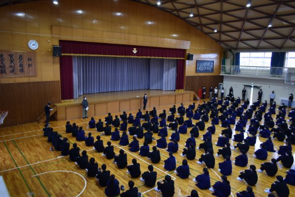 2021年4月14日(水)地震を想定した防災避難訓練を実施しました。 地震発生の非常放送で、生徒は一斉に机の下に入るなど避難姿勢をとりました。 避難経路を確認しながら体育館に集合し、非常時にも冷静に行動するようにと校長が講評しました。 「2021/04/14up]