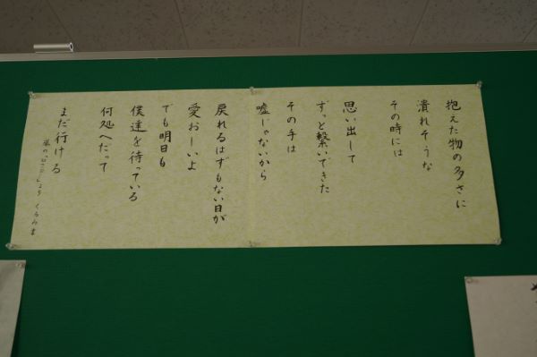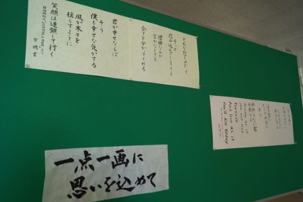 「暮らしの書道」「実用書」を選択している生徒の作品が、本校2階ピロティで展示されています。 一人ひとりの個性があふれ、味わい深い作品が並んでいます。 「2021/12/15up]