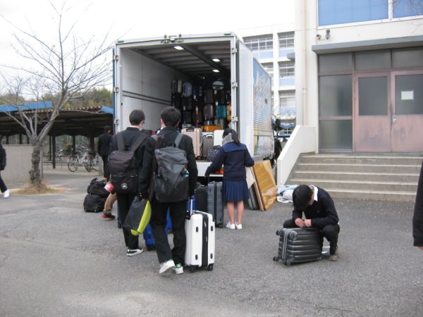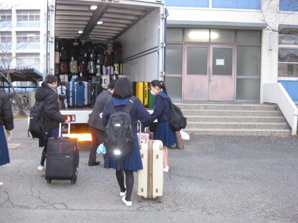 2022年1月7日(金)来週の修学旅行に向けての先送り荷物の積み込み、発送がありました。 それぞれにカバンには一杯の荷物を、胸には大きな期待を詰め込んで、 来週から修学旅行に行って参ります。 保護者の皆さま、朝早くからご協力、ありがとうございました。 「2022/01/07up]