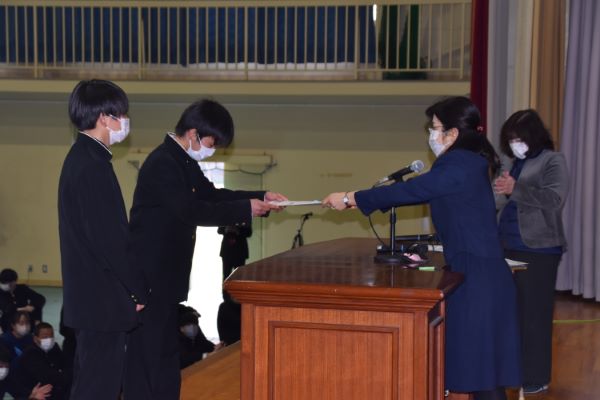 2022年3月23日(水)令和3年度3学期終業式を行いました。 校長先生による式辞では、福沢諭吉の言葉が紹介され、「利用してこそ学問である」と話されました。 終業式の後、表彰伝達があり、吹奏楽部、放送部、バドミントン部、バレーボール部、美術部の成績が披露されました。 「2022/03/23up]
