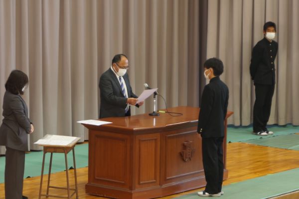 2022年4月8日(金)令和4年度着任式・始業式を行いました。 今年も新たに先生方をお迎えし7名の新着人の先生と職員の紹介を行いました。 始業式では校長式辞、校歌斉聴を行いました。続いて新しい年次団・各部長の紹介があり、表彰伝達では水泳部の成績が披露されました。 「2022/04/08up]