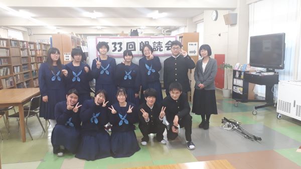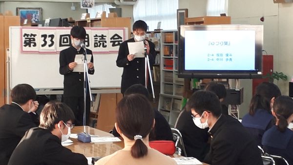 2021年11月19日(金)に第33回朗読会を実施しました。1、2年次図書委員24名の他、一般生徒8名、教職員及びPTA7名に参加していただきました。