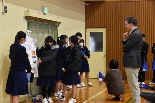 同窓会館でALTの出身国のプレゼンテーションを聞いた後体育館に移動し、各都道府県についてポスターにまとめたものを、班ごとに英語で説明しました。ポスターセッションではALTも参加し、他の参加者も英語で質問をするなどし、英語のコミュニケーション能力を育成するとともに、国際理解を深める一日となりました。