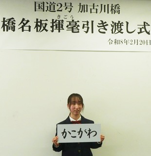 国道2号 加古川橋 橋名板揮毫引き渡し式が 加古川総合庁舎で 行われましたに 揮毫した 本校書道部 2年次 山本さんが 出席しました |