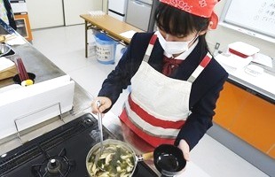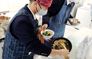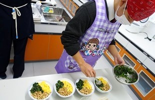| 1年次 家庭基礎 調理実習 三色丼 豆腐としめじのすまし汁 |