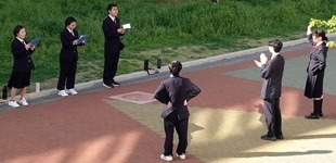 | 放送部 早速中庭で練習を始めました |
