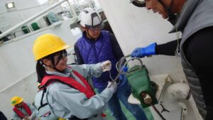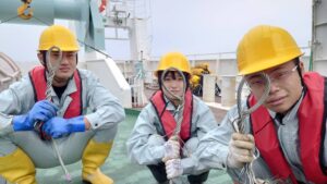 次に、水産研究・教育機構さんの見学に行きました。「陽光丸」では東シナ海での資源量調査の話を聞きました。私たちも但州丸で同じように調査をしているので、わかりやすかったです。クロマグロの養殖の施設も見学しました。クロマグロ資源の話を聞き、資源保護の大切さを改めて感じさせられました。