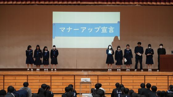 この期間中の取り組みをマナーアップ集会で発表し、学校生活におけるマナー意識の現状確認と振り返りを行いました。