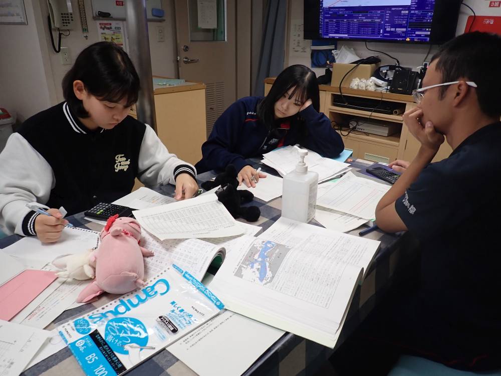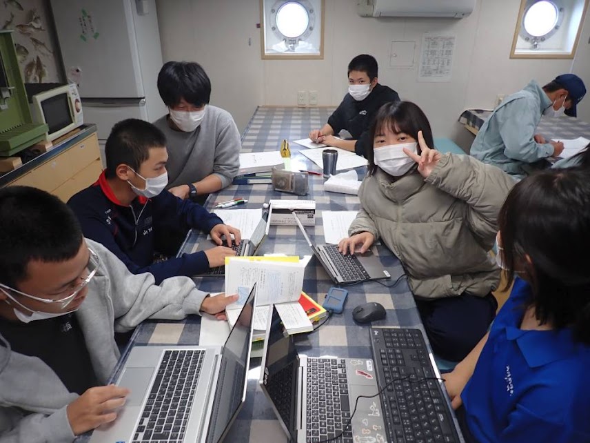 今日も操業予定がなくなったため、作業班は食堂で勉強をしました。法規の小テスト、船長講義と充実した一日でした。私の班は、自主操業が一回もなかったので、少し残念でしたが、前半のトロール調査はなかなか電波も入らず、船酔いも多かったために、湾内で静かに錨泊すると家族や友人と連絡を取ることが出来て、後半の航海も頑張ろうと思うことが出来ました。