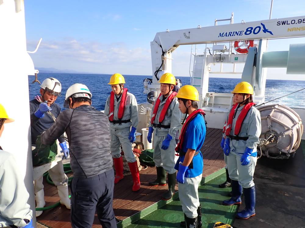 今日は、第二次トロール漁業実習の乗船一日目でした。本当は15時出港予定でしたが、天候不良により出港が明日に延期になり、乗船式と航路学習を行いました。