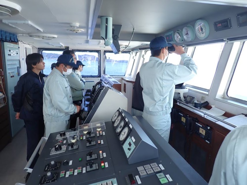 待ちに待った航路発表会の日、朝一番に浦賀水道航路と中ノ瀬航路の航路見学を行いました。チョッサーに航路標識や航路の特徴の説明をしていただきました。東京湾の船舶の多さに驚きました。