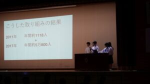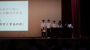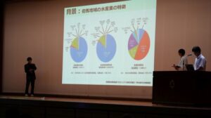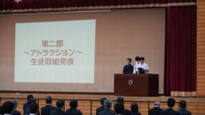 第2部では、生徒たちによるアトラクションとして、海洋科学科の生徒による課題研究発表、普通科の生徒による総合的な探究の時間の発表を行いました。