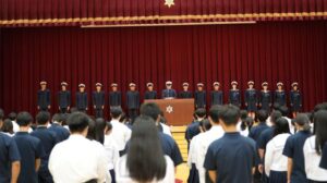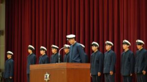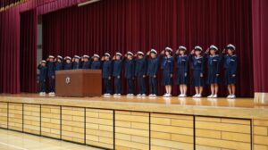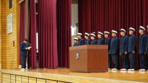 2年生海洋科学科オーシャンコース実習生18名は、全校生徒の前で、約1か月に及ぶトロール漁業実習の意気込みを述べ、実習の成功と自身の成長を宣言しました。