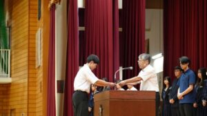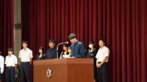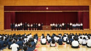 10月17日(金)後期生徒会役員認証式が行われました。認証式では前期生徒会長からの退任のあいさつとお礼、そして新生徒会長からの着任のあいさつがありました。伝統を引き継ぎつつ、新たな体制で香住高校を盛り上げていきます。