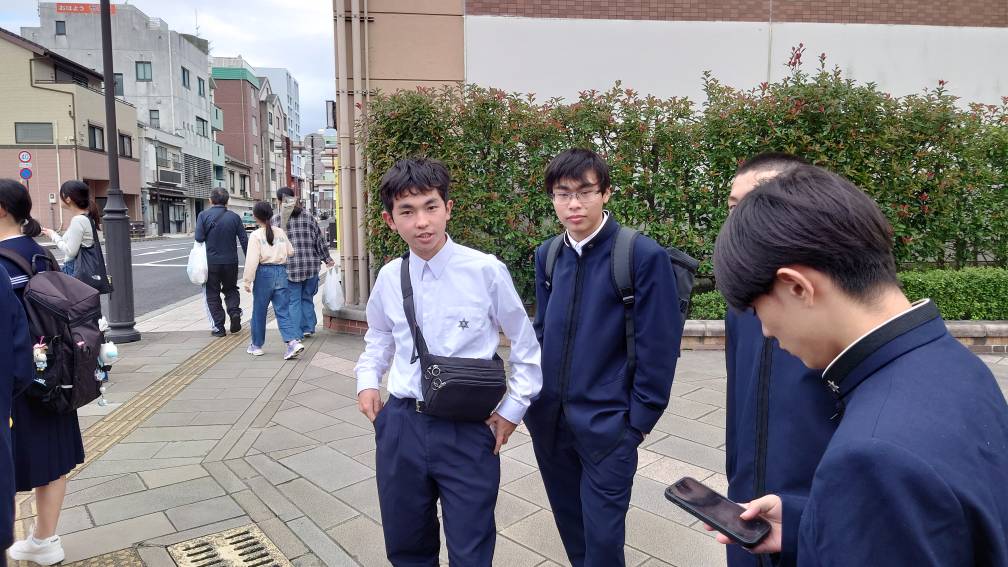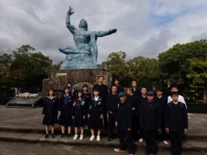 朝はアラームが鳴る前に船の揺れで目が覚めました。久しぶりの強い揺れだったので、酔い止めを飲んでいても少し気持ち悪くなりました。入港作業を頑張って手伝いました。長崎に入港してからは、路面電車に乗っていろんなところに行きました。お昼に長崎ちゃんぽんを食べた後、全員で原爆資料館を見学して平和記念像で集合写真を撮りました。資料館で当時の写真を見て原爆の怖さを実感しました。爆弾が想像していたよりも大きくてびっくりしました。その後はちりんちりんあいすやザラメがついているカステラを食べたり、中華街でフルーツ大福を食べたりしました。全部美味しかったです。最後に諏訪神社に行きました。階段がしんどかったけど上から見た夜景がとても綺麗でした。暗くて怖かったので次は明るいときに行きたいと思いました。初めて路面電車に乗ったり、長崎の名物を食べたり綺麗な景色を見て長崎を楽しめたので良かったです。
