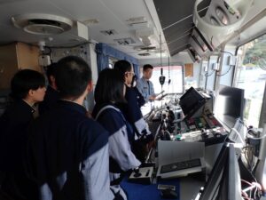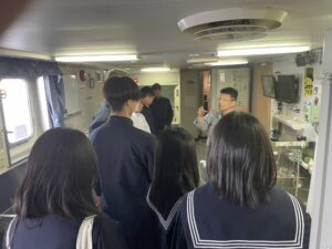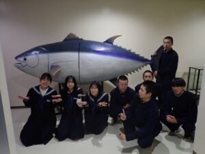 次に、水産研究・教育機構さんの見学に行きました。「陽光丸」では東シナ海での資源量調査の話を聞きました。私たちも但州丸で同じように調査をしているので、わかりやすかったです。クロマグロの養殖の施設も見学しました。クロマグロ資源の話を聞き、資源保護の大切さを改めて感じさせられました。